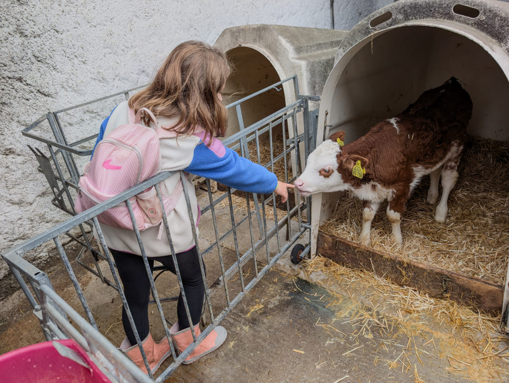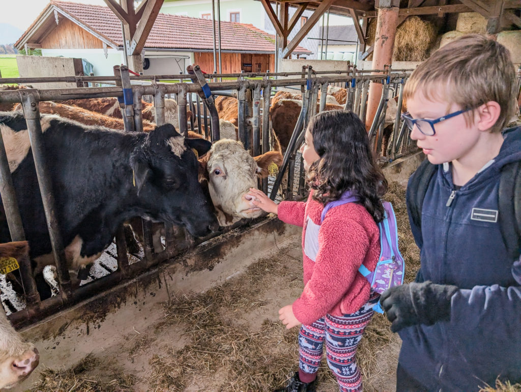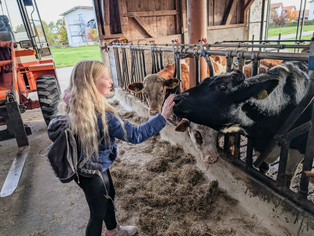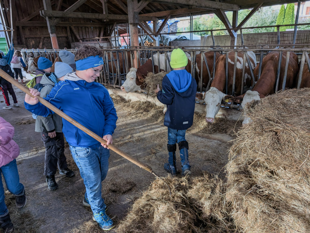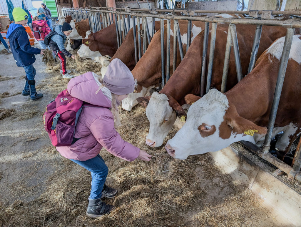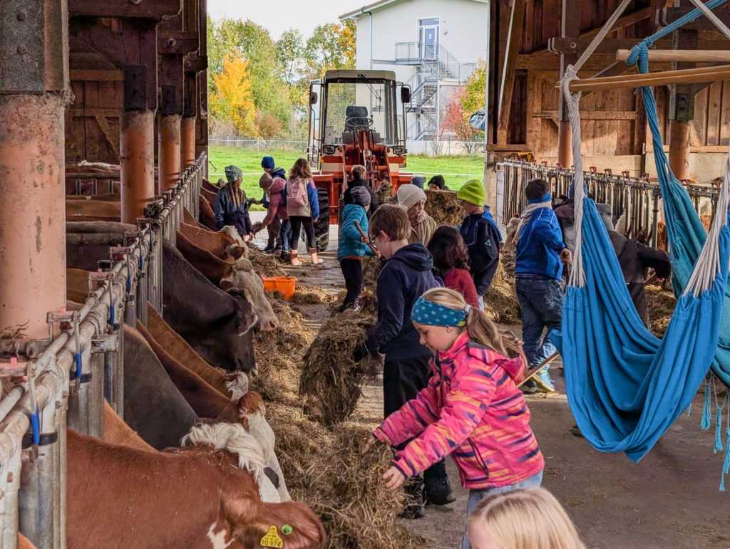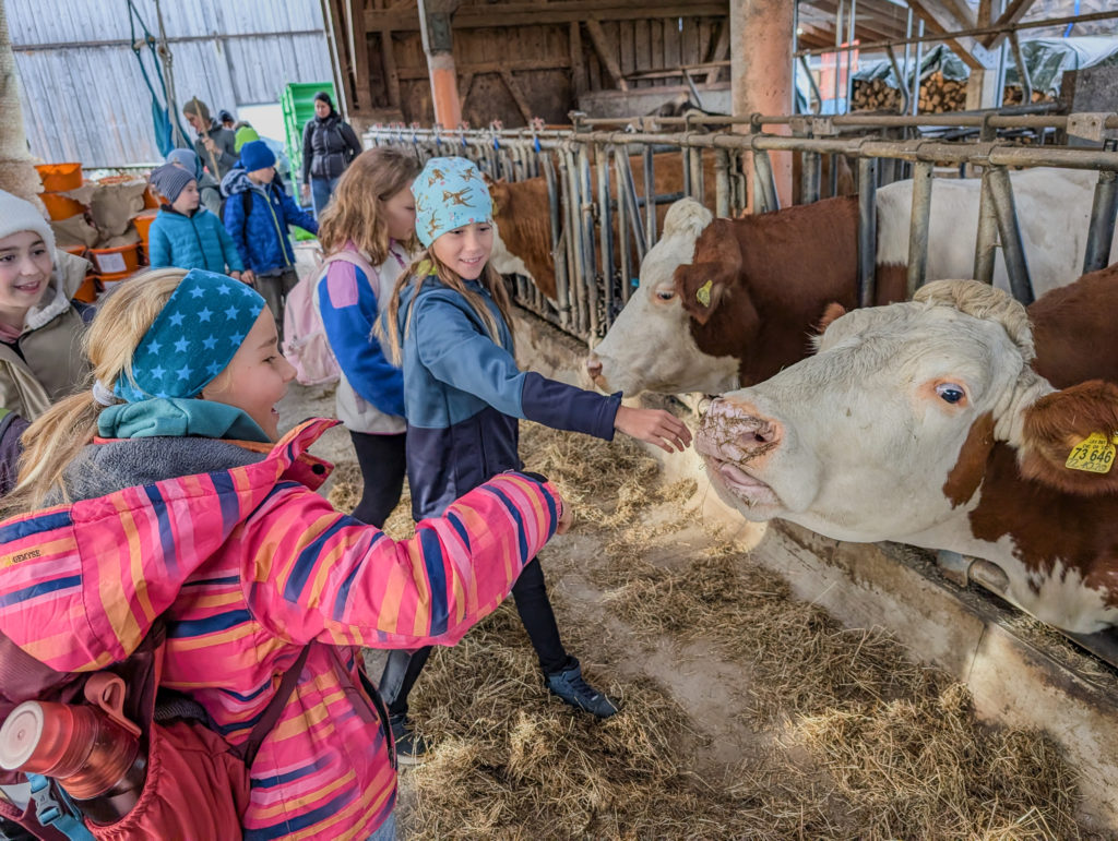 Christine Weibhauser führte die Kinder über den Hof, wo sie viel über die richtige Haltung und Pflege der Tiere erfuhren. Besonders viel Freude bereitete es der Klasse, die Kühe mit Heu zu füttern. Auch vor Kurzem geborene Kälber konnten die Schülerinnen und Schüler bestaunen und streicheln.